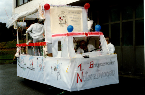 Beim Fasnatumzug 1987 in Egg wurde erstmals der Prototyp des Notarztwagens, genannt NAW, der Bevölkerung von Hubert Feuerstein, Markus Meusburger1, Bartle Felder, Helmut Simeoni und Roland Zimmermann vorgestellt.